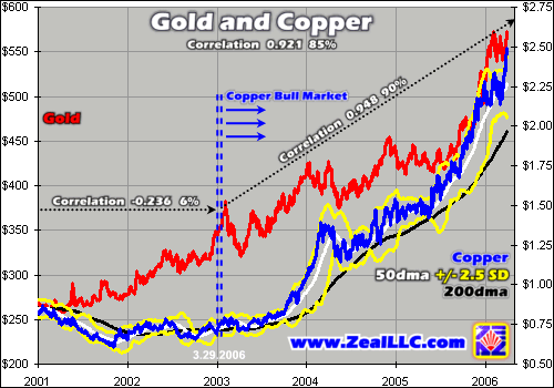 And to zoom in a little further, all five of these base metals including copper have an average correlation to gold so far in 2006 of only 0.617, with an r-square of 38%. So even though the strategic trends have higher correlations, the tactical performances of the metals in 2006 still show independence.