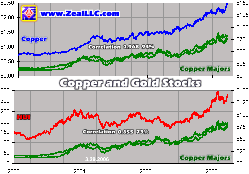 After looking at this chart, the herding-metals-stocks theory may not have as firm a ground to stand on as thought. Gold stocks, represented by the HUI, have throughout this bull market had an excellent correlation to the underlying metal they produce. Bull to date gold and the HUI have had a correlation of 0.964 with an r-square of 93%. But the copper majors listed above have had a correlation to the HUI of only 0.855, an r-square of 73%.