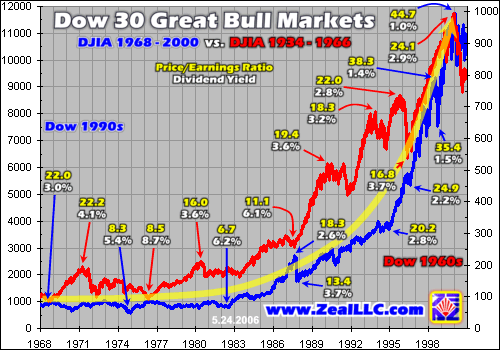 While the 1960s great bull was up roughly 10x, from around 100 to 1000 over 17 years, the 1990s great bull handily exceeded these gains. It was up about 15x in nominal terms from 1982 to 2000, a stupendous bull run by any standards. As you ponder these statistical similarities, carefully examine the chart above as well. In pure price-pattern terms the last two great bulls had a great deal in common in their ascents. In both cases investors increasingly poured capital into stocks driving their valuations well above fair value to overvalued levels.