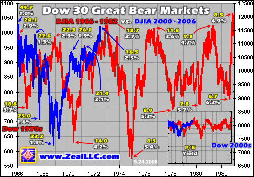 This history is frightening enough alone, but the current progress of the US stock markets since 2000 has been mirroring that of the first 6 years or so of the last great bear to a remarkable degree. Just as in the last great bear, we have seen brutal downlegs like the one that ended in late 2002 and awesome rallies, or cyclical bull markets, like the one we’ve seen since early 2003. As this chart shows, even on the zeroed-axis inset version, the magnitude of recent Dow 30 moves is exactly on target with those of the early 1970s.