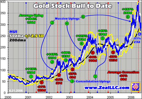 This first chart is the latest update of one we have used many times at Zeal throughout this gold stock bull. It is a secular rhythm chart of the HUI, showing the six major uplegs and six major corrections that have manifested themselves in this index since its bull market began. Understanding this chart is very valuable because it helps set expectations about what kinds of gains and losses are possible in the HUI based on precedent.