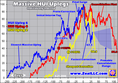 I have been studying this phenomenon for a couple years now and find it quite fascinating. There has to be some underlying reason why massive uplegs are typically followed by consolidation uplegs. The leading theory in my mind has to do with speculator psychology surrounding major new bull-to-date highs in the HUI.