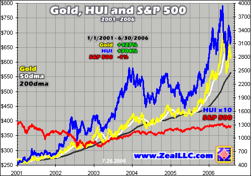 As you can see in the chart above, gold stocks as measured by the HUI have been in a league of their own. To illustrate, let’s say on January 1, 2001 you had put $10,000 each into the S&P 500 Index (SPY), physical gold and split among the weighted HUI components. If you had held through the end of Q2 2006, you’d be sitting on $9,900 in the S&P, $22,700 in physical gold and $80,400 in gold stocks.