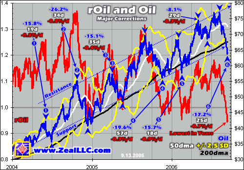 In order to define a major correction, I considered it any sharp slide in oil prices that happened right after a major upleg or rally that carried oil well above its 200-day moving average. In addition the subsequent slide had to drag oil back down near or below its 200dma to make major-correction status. Anything that fell short of this definition was just considered a pullback and is not analyzed, with the single exception of a recent mid-2006 minor oil pullback that is discussed later.