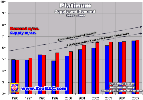 With the high price of platinum these days, as I well know, jewelry consumption has been down from a mere affordability standpoint. Instead of placing new orders, jewelers have been depleting stock and recycling consumer-sold metal. And surprisingly another big reason for jewelry decline last year was Chinese lore. Last year was the Year of the Rooster, in which it is traditionally a bad year to get married. 2006 is the Year of the Dog, and weddings are expected to skyrocket in China significantly increasing jewelry demand, with platinum not being an exception.