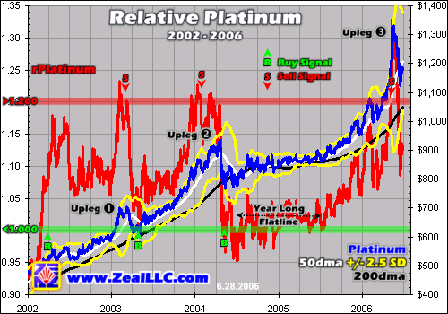 The chart above provides a probabilistic trading band showing when odds favor a surge or correction at any given time. As you can see, the horizontal relative support and resistance lines have provided us with fairly good and reliable entry and exit points for platinum. Since 2002, there have been three notable uplegs in platinum. And in each of these uplegs, relative buy signals allowed us excellent entry points and relative sell signals allowed us to capture a large portion of the gains before the following correction.