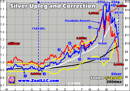 At Zeal we were very bullish on silver late last summer when despair abounded. The lead article in the 9/05 ZI was called “A Silver Lining” and its core thesis was that silver looked fantastic fundamentally and technically and silver ought to surge once speculators returned from their summer vacations. The time to be bullish on anything is not when everyone else is like in early May 2006, but when barely anyone else is like in August 2005.