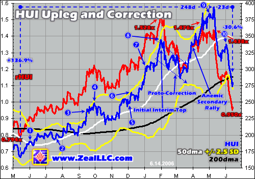 10. HUI 334 “And by bull-to-date standards, this correction has barely started. We are 14 days into it so far and down 21% at its worst point on a closing basis. The five previous major HUI corrections in this bull averaged 30% losses over 88 trading days. And the biggest uplegs tended to have deeper losses compared to the average. This recent upleg that just broke was up 137%. … So odds are we are in for considerably lower HUI levels and months of grinding. If the HUI corrects at its 30% bull average, 275ish is where it will bottom. If it drops 35% like the comparable big uplegs that went before it, then we are looking at 255ish. Both are below the HUI’s 200dma. Unfortunately, unlike gold, we’re not able to rely on the HUI’s 200dma holding as support. In both 2004 and 2005, the HUI spent four to five months or so in each year well below its 200dma. Its corrections in both of those cases each bottomed just under 0.80x its 200dma.” - ZI 6/06