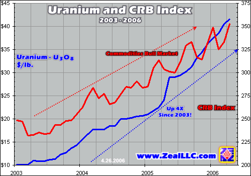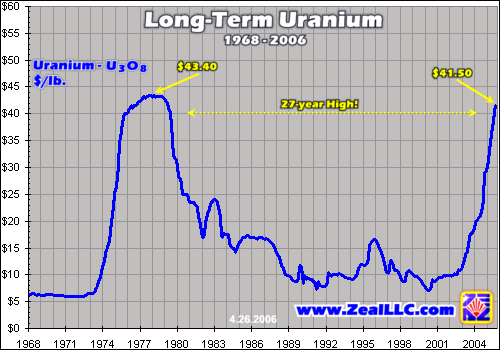 As recently as 2000 uranium was trading as low as $7 per pound while today it trades at $41.50, a massive 493% gain in just six short years. This gain dwarfs those of most every other metal and energy commodity, and I believe there is still much more room to run.