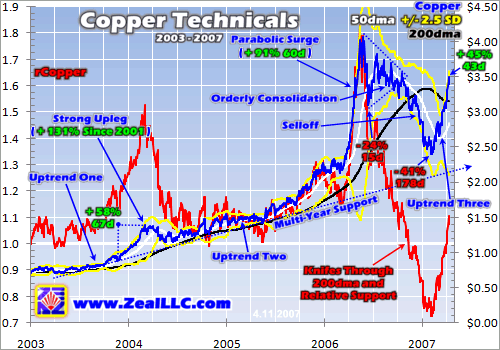 The base metals have been fascinating to watch from a technical perspective. In 2006 there were some wild parabolic surges that are typically only seen toward the ends of bull markets. But since fundamentals point towards the base metals prospering for at least another decade, it was sure going to be interesting to watch the corrections unfold.