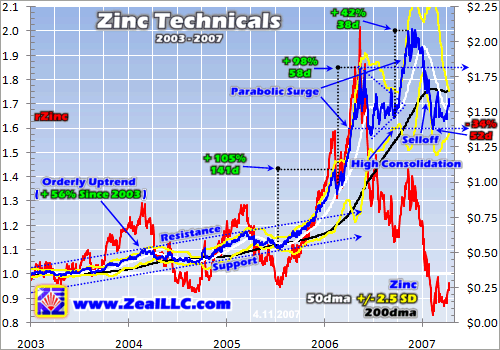 Like copper, zinc had a fairly orderly uptrend up until the latter half of 2005. Huge Asian demand mixed with a little speculative excitement prompted three distinctly powerful rallies that shot zinc well out of its trend channel to far exceed its all-time nominal highs. The first of these monstrous rallies peaked in the first quarter of 2006 and happened in quasi-parabolic fashion.