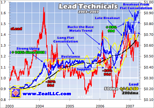 In the first half of 2006 when the other base metals were shooting to the moon, lead took the opposite path and entered into a nearly six-month downtrend. In 96 trading days lead shed 24% and appeared to be the plague of the commodities world. You would have thought we were back in the 1970s and 1980s when environmental drawbacks from lead usage in paints and gasoline were gnawing at this metal.