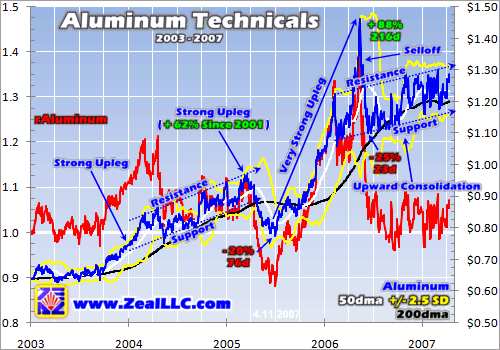 Overall aluminum’s upleg appears to be more orderly than the other base metals. Like the others it had a strong 2003/2004 upleg that produced a solid uptrend off of its highs. Then after an early 2005 correction aluminum rocketed to its high near $1.50 that capped off a quasi-parabolic surge.
