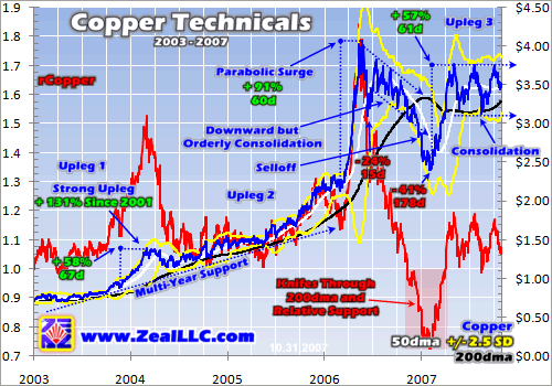 When looking at copper technicals and attempting to gain a grasp on where the metal is going, we first need to look at where it came from. Since copper’s bull really began in 2003 there are what appear to be two distinct uplegs that have run their courses. The first upleg ended in March 2004 with a strong 67-trading-day surge that vaulted the price of copper 58%.