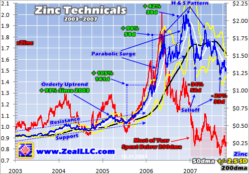 Like copper, zinc had an orderly long-term uptrend up through the middle of 2005. After a minor five-month pullback that took zinc to its July low of $0.53, it entered into an upleg of epic proportion. This upleg spawned three very powerful surges that took the metal to price levels that are simply mind-blowing. And the drivers behind this upleg were of course a result of bullish fundamentals mixed with a little speculative fervor.
