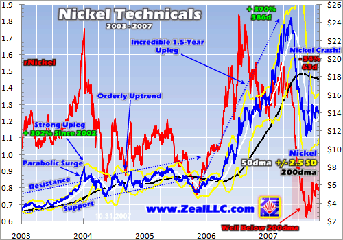 Nickel’s bull actually began in late 2001. From its $2 low at the time to its May 2007 high over $24, nickel has at best been up an astonishing 1,100%+. Even at the apex of the late 2004/early 2005 base metals rally nickel was already outpacing the other metals and was up over 300% since the beginning of its bull.