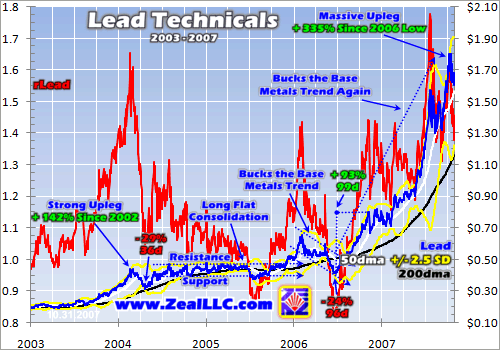 Long the pariah of the metals complex with its bumpy history, lead has taken the outside lane and blown past its peers to be one of the best-performing commodities in the entire global commodities bull market. Lead started its bull strong and began its ascent higher in late 2002. Its initial run was capped by a powerful upleg that shot its price past the highs of a decade ago gaining 142% before entering into a long consolidation stage.