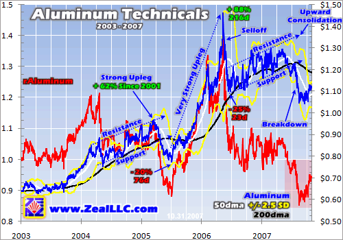 With LME aluminum stockpiles trending higher since the beginning of 2006, aluminum’s upward consolidation through May 2007 was doomed to break to the downside. And indeed it has as aluminum has spent the better part of the last six months trading below its 200dma support.