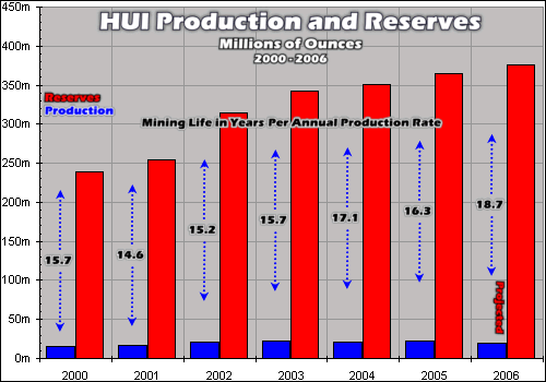 The 2006 production data, also displayed in the first chart, is projected based on the latest guidance numbers that each of the HUI producers reported. And the 2006 reserve data is projected with a calculated growth rate based on historical data. I eagerly anticipate the full-year data from each of these companies that should be reported in the next couple months, but these projections should be relatively close to reality and should serve just fine for our purposes.