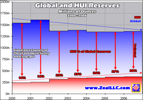 Interestingly, according the USGS, global reserves in 1980 were estimated at 1.13 billion ounces. As of the end of 2005, global reserves were estimated at 1.35 billion ounces. So in 25 years global reserves have grown by about 19%. Though not as impressive as the reserve growth rate of the HUI, it still equates to a global mining life of about 17 years.