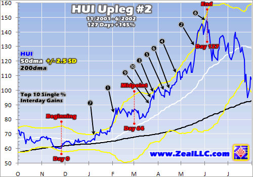Also exciting was that of the 127 trading days in upleg 2, 13 days, or 10% of the time, the HUI experienced a greater than 4.0% interday gain. And the average daily gain for this upleg was an incredible 0.74%, the best of any upleg to date. What an exciting upleg!