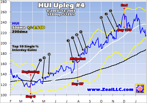 In this next chart I give the same examination to HUI upleg 4. This upleg turned out to be a fantastic run in gold stocks that rewarded its investors with remarkable 2003 gains and vaulted the HUI above 200 for the first time since its 1996 inception. Upleg 4 was also pivotal in solidifying the case that gold and gold stocks were indeed in a secular bull market.