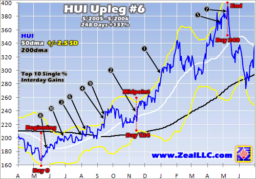 So now with mixed results in these first two massive HUI uplegs, let’s take a look at what the latest massive HUI upleg reveals from a big-daily-gain perspective. Upleg 6 is shown below, and it is this upleg that vaulted the HUI close to 400, a nearly 1,000% gain from its late-2000 low.