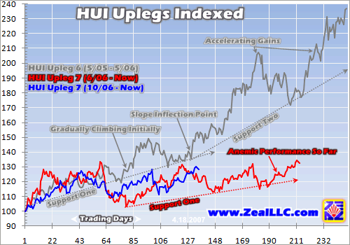 Interestingly the lion’s share of the total gains in upleg 6, by far, occurred in the second strong half, not the weak first half. If we are indeed on the cusp of the second half of upleg 7, the HUI should really start accelerating higher soon. While all the true contrarian buying has already been done in this upleg since October when few believed in its potential, big momentum gains can still be won going forward if this upleg unfolds like previous ones.