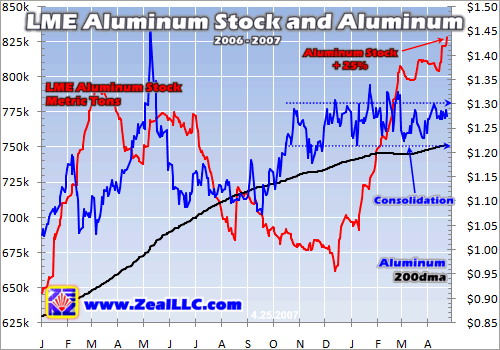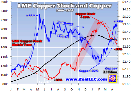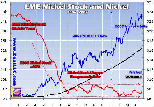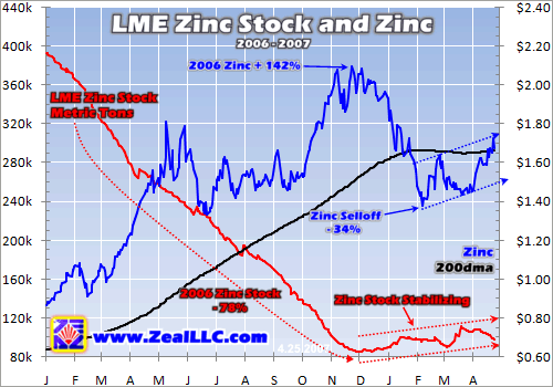 Shifting to zinc, it had an amazing 2006 run as its LME warehoused stock plunged in sharp linear fashion. A sizeable supply and demand imbalance emerged last year as LME warehouses were pilfered of nearly all the zinc consumers could get their hands on.