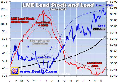 When you look at an LME lead-stock chart it becomes apparent why this was the case. In the first half of 2006 lead stockpiles actually rose by an impressive 181%. Lead subsequently shed 37% in this timeframe until it hit its interim bottom in June. And of course almost like clockwork, as LME lead stock started to fall the price of lead began to rise.
