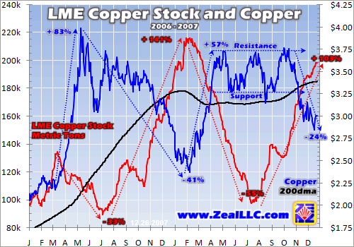 Surprisingly instead of crashing after the parabola, the price of copper consolidated downward off its top in orderly fashion. While still in the mid-$3.00 range copper ground downward slowly as stockpile levels began to rally higher. Then in October 2006 the increase in copper stockpiles accelerated causing copper to break its trend channel on the downside and eventually fall to its February 2007 low.