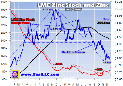 But 2007 has certainly been a different story. Looking at what the price of zinc has done in 2007 you would think LME stockpile levels were soaring. But this is hardly the case. Now when zinc stockpiles leveled in December 2006 it makes sense that some of the speculative risk premium built into its lofty price would be shed. And this is what we saw. It then also makes sense that when stockpile levels started to fall once again in April 2007 that zinc would rally.