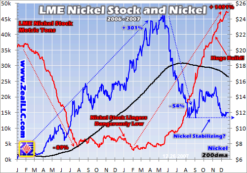 Lagging copper and zinc, nickel’s massive upleg stayed hot all through 2006 before it reached its apex in May 2007. This incredible strength was in large part due to a plummeting LME nickel stockpile. In just six months, from February to July 2006, LME nickel stockpiles fell by 89%!