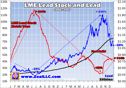 While the other base metals were picking up steam in 2005 and the first half of 2006, lead was in the doldrums. In the first half of 2006 LME lead stockpiles saw a hefty build of 181%. This of course did not bode well for the price of lead. During this time lead fell 37% before finally getting some reprieve.