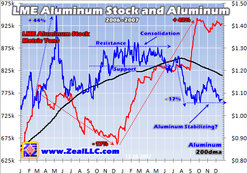 In the latter half of 2007 with most of the base metals exhibiting weakness, aluminum has followed suit. LME aluminum stockpiles initiated a build in the beginning of 2007, and in August aluminum’s sideways consolidation finally broke to the downside. But even this downside loss was a modest 17% at worst and the price of aluminum seems to have found some short-term support over the last few months.