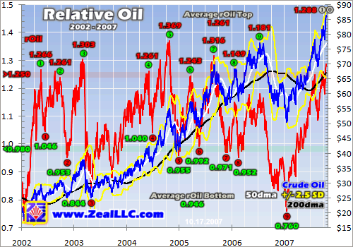 This next chart looks at the oil bull compared to relative oil, or oil divided by its 200dma. This rOil value is rendered with the red line. After 9 major uplegs and corrections since late 2001, rOil has established a definite horizontal trading range. By examining how far oil has been able to pull away from its 200dma in these past uplegs before greed became too extreme, we can gain a better understanding of the probabilities for a sharp correction today.