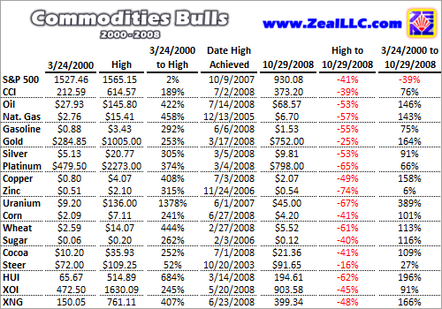 Since there is no official date that marks the beginning of the commodities bull, as individual commodities began their bulls at different times, for reference sake I used a date that I believe marked the end of the secular stock bull. March 24, 2000 was when the flagship S&P 500 (SPX) index reached its apex, and this is as good a point as any to mark the beginning of the commodities bull.