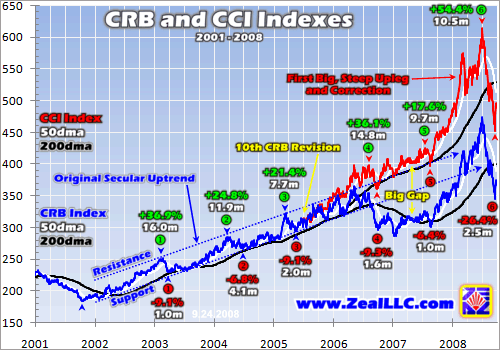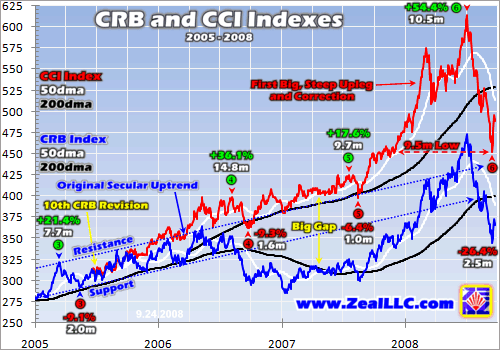Meanwhile the real ninth-rev CRB, now in the form of the CCI, was breaking above resistance in mid-2006. The CRB’s original secular resistance line became support in late 2006 and 2007. Provocatively, as of mid-September 2008 the CCI wasn’t even back down to resistance yet (say 440) let alone secular support (about 400). No competent technically-oriented trader would even think about declaring a bull dead before its long-term support lines decisively failed! The CCI is doing just fine technically.