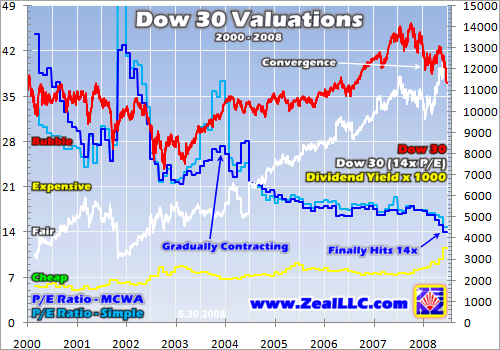 This chart, updated from my October 2002 original one, shows this process visually. It looks complicated, but it is straightforward. The pair of blue lines is the index P/E ratio for the Dow 30. At Zeal we compute these critical numbers, along with the S&P 500’s and NASDAQ 100’s P/Es, once a month and publish them in our monthly newsletter. Watching index valuations is incredibly important for all long-term investors.