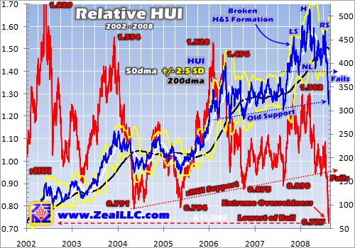 My Relativity trading theory applied to the HUI offers a great read on prevailing PM-stock sentiment. It simply takes the HUI and divides it by its own 200-day moving average on an ongoing basis. The resulting multiple forms a horizontal trading range. High rHUI points represent extreme greed and low rHUI points represent extreme fear. The greater the numerical extreme, the more intense and unsustainable the emotion driving it.