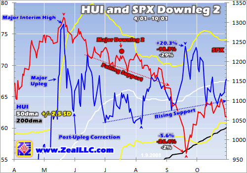 And in this downleg, like in the first, the HUI did seem to follow the SPX lower at times. In particular note the fast parallel declines in late August and early September 2001. But in early September, the HUI bounced at support and actually soared during the brutal terminal stage of the SPX plunge! The final terminal decline, a bone-shattering 12.7% in just 7 trading days, is when general-stock fears surged to the greatest extremes. Yet defiantly the HUI rose dramatically during these fears, up 15.0% to the day!