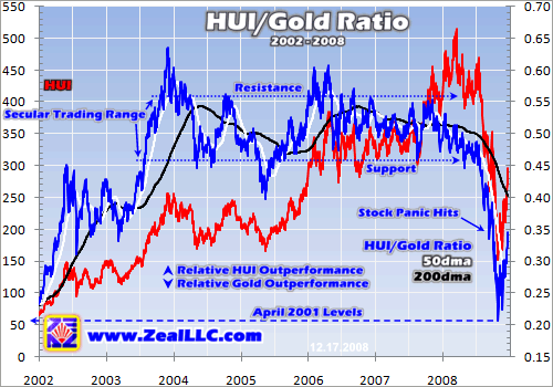 While the profits from the low-hanging fruits of this panic anomaly have already been realized, the HUI has still not returned to its long-term equilibrium with the gold price. In other words, even if gold remained flat in the $700s today’s gold-stock prices are still too low. This is readily apparent when you look at a long-term HUI/Gold Ratio chart. The HGR distills the HUI’s relationship with gold into one clean technical line.