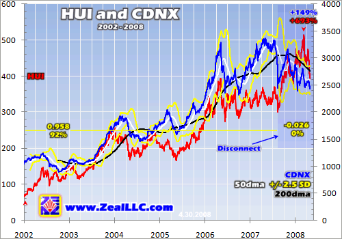 Well looking at this first chart you can see that from 2002 to around the middle of 2007 the HUI and CDNX moved near lockstep with each other. The CDNX of course didn’t experience gains at the same magnitude as the HUI, but this is simply because its minor weightings in such sectors as technology, real estate, R&D, and other industries rounded the sharp moves of the mining stocks.