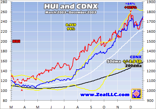 From the beginning of 2002 up through the very day of the HUI low in August the HUI and CDNX ran a very tight correlation of 0.958 as indicated in yellow on the chart. This correlation returns an r-square of 92%, which means that 92% of the daily behavior of the CDNX can be explained by the daily behavior of the HUI.