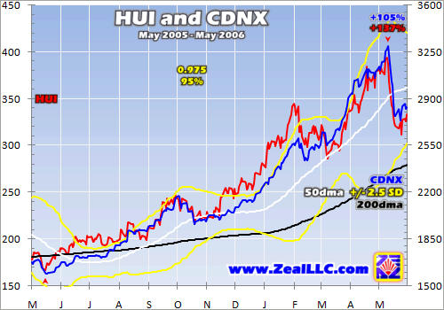 Next we take a look at how closely the CDNX followed the HUI over the course of massive upleg 6. And again at first glance we see near-parallel movements between these two indexes. In this upleg the HUI greatly rewarded gold stock traders by rising 137% before it reached its apex in May 2006. And the CDNX didn’t do too shabby itself with a nice double over this same period of time.