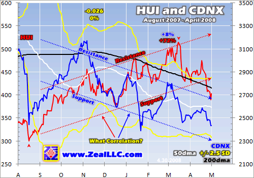 We then get to August 2007, the beginning of the latest upleg in gold, and see that there is a disconnect in the harmony that these two indexes shared. If we take a look at the mathematical correlation between the HUI and CDNX it tells quite a story.
