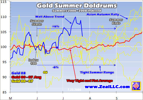 Interestingly, gold’s recent sharp rally from mid-June to mid-July 2008, rendered in blue, actually ran well above trend. This was much higher than I expected. Nevertheless, we were gaming gold’s summer trading range in Zeal Speculator. I recommended GLD calls in mid-June (low in the range) that we ended up selling in mid-July (high in the range) at an 87% realized gain. So even as gold drifts sideways, traders can buy low and sell high within its summer range.