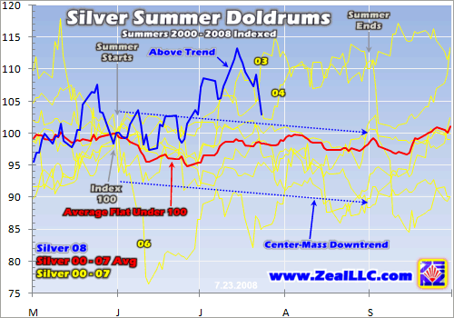 As silver is far more volatile than gold, its summer-doldrums trend is not quite as clean-cut. Nevertheless, the center-mass trend based on silver’s indexed summers between 2000 and 2007 is definitely down. 5 of these 8 summers spent almost all of their time in the downtrend rendered above. And none of the 3 outliers could spend more than 2 months at a time outside of this prevailing downtrend.