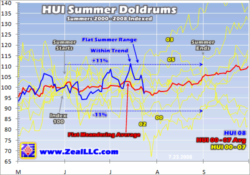 The HUI’s summer-doldrums pattern is more variable than gold’s or silver’s. In June and most of July, for every summer since 2000 the HUI has traded in a flat summer range between -11% to +11% of its final close in May. Translated into today’s HUI levels, in 2008 this range runs from 375 to 468. And interestingly this summer the HUI has traded between 397 and 469 on a closing basis, which is right in line with precedent.