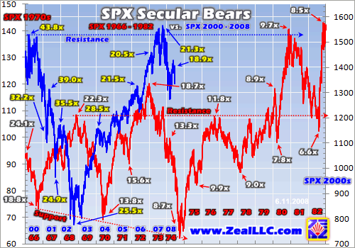 Thus the SPX was essentially dead flat over nearly 8 years, it just traded sideways! Investors who bought stocks in late 1999 or early 2000 along with the popular mania had just started breaking even again by late 2007. General stocks were terrible investments over this span. Overlaying this 2000s sideways action on top of the last great-bear grind from the 1970s is very revealing. The white and yellow numbers are SPX P/E ratios for their respective eras.